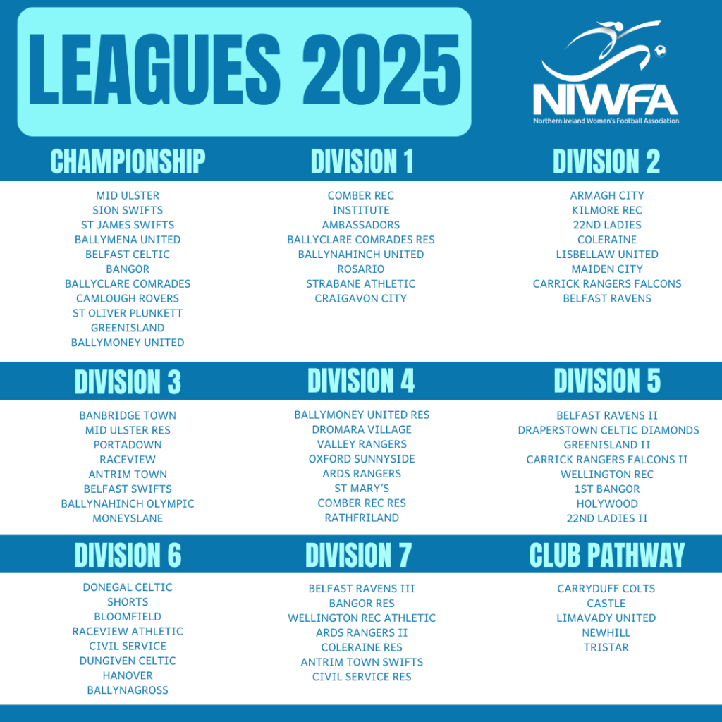 The NIWFA leagues for 2025 are divided into multiple tiers, starting with the Championship at the top and extending down through Division 1 to Division 7. The Club Pathway League also provides an entry point for clubs preparing to transition into the main league structure.